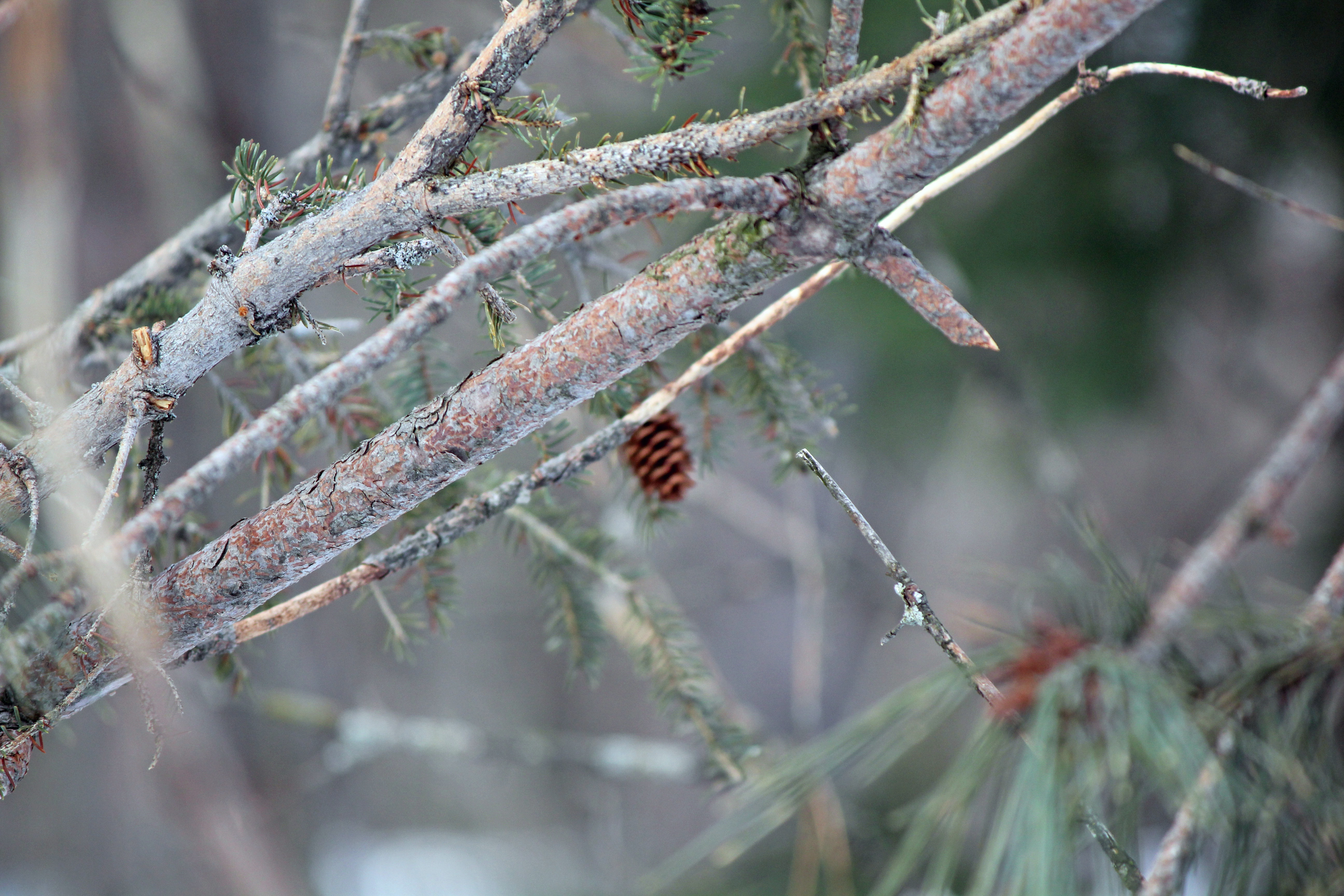 One of the things about walking through a forest in winter are the sounds. When we first ventured outside, we were greeted with the songs of birds — almost as if they were calling to spring. Once we were on the trail, though, the silence is amazing. Then the wind would pick up and the dry tree branches would tremble, sound like the Hag of Winter rattling her bones.