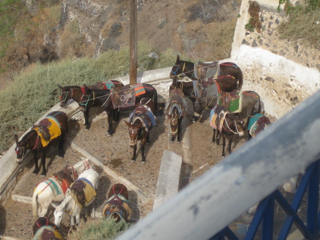 Fortified with wine, I decided to walk down the 580 steps from the top of Fira to the pier. I forgot a few things: my knee, the donkeys, and 580 stairs. Sometimes my knee hurts going down stairs. So walking down that many steps, no matter how “easy” might not be in my best interest. but I forgot about my knee and headed off!